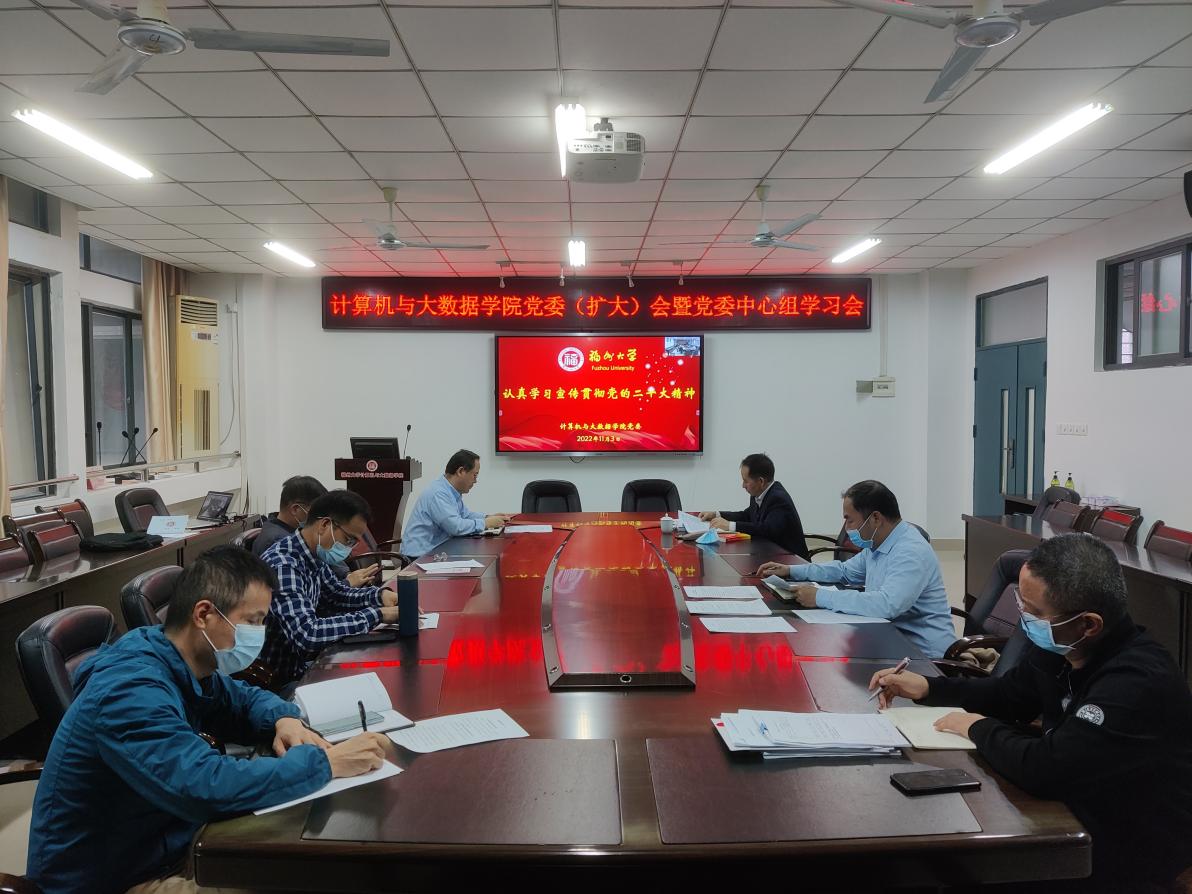 11月3日,计算机与大数据学院党委在计算机学院2号楼219会议室召开党委(扩大)会议暨党委理论学习中心组学习会议,传达学习党的二十大和党的十九届七中全会、二十届一中全会精神,传达学习习近平总书记在中央政治局会议、中央政治局集体学习时的重要讲话精神,传达学习省委常委扩大会议、省委常委会会议精神,传达学习校党委全委会(扩大)会暨党委理论学习中心组学习会精神,并对学院学习宣传贯彻党的二十大精神作出具体工作部署。学院党委委员在主会场参加会议,其他支部书记、中层干部通过线上参加会议。