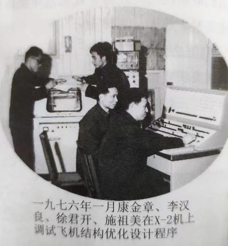 康金章、李汉良、徐君开、施祖美在x-2机上调试飞机结构优化设计程序
