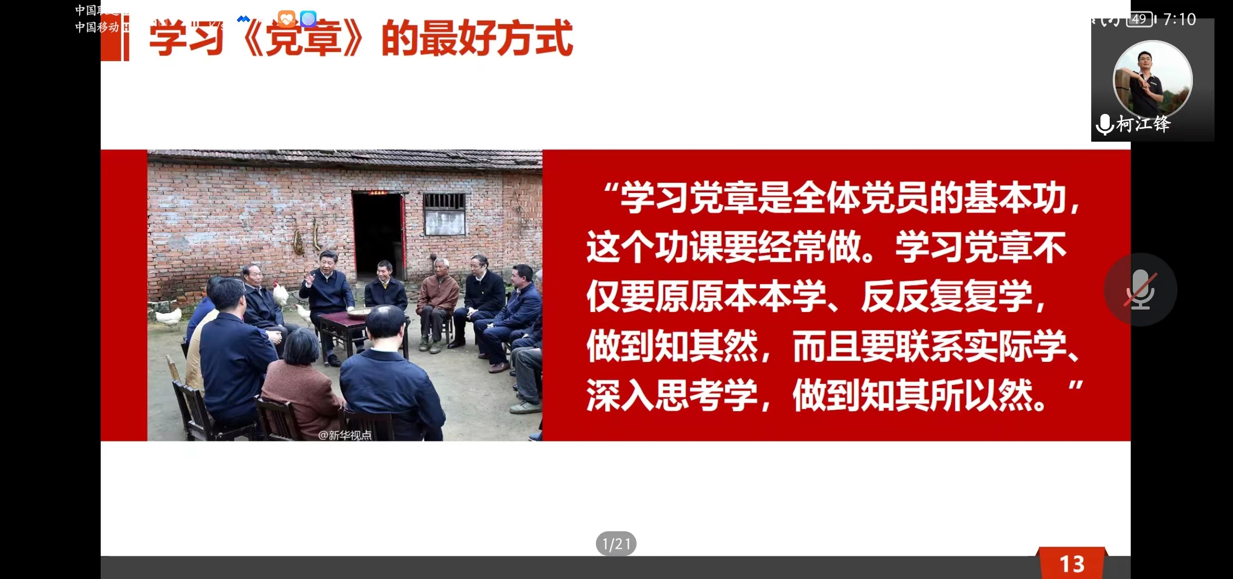带领大家分析了学习遵守党章的重要性,从三点(法律地位、产生程序、功能作用)来看,党章居党的法规体系之首,并全面指导党的工作。